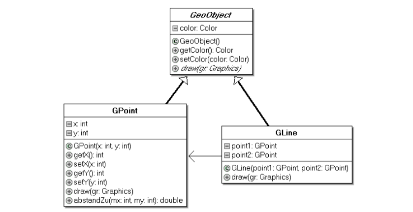Damit sind die beiden Klassen GPoint und GLine Spezialisierungen von GeoObject. Sie sollen alle Eigenschaften und Fähigkeiten (Also Attribute und Methoden) von GeoObject besitzen und darüber hinaus noch eigene Eigenschaften ergänzen.