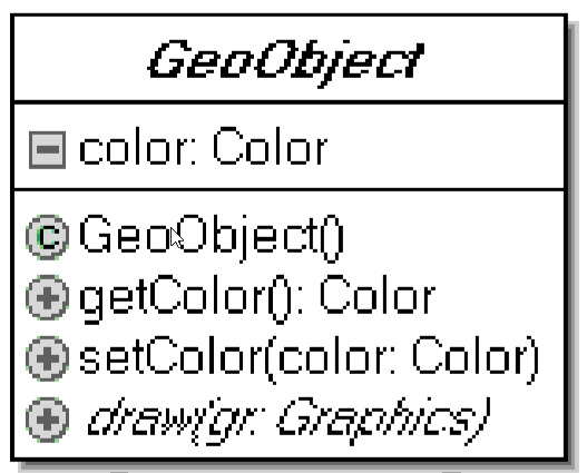 color, das als private definiert wirdGeoObject(), der keinen Parameter entgegennimmt. In ihm wird das Attribut color intialisiert. getColor() und Setter setColor(Color colorNew) für colordraw(Graphics gr), die den Rückgabetyp void besitzt, als public definiert wird und einen Parameter gr vom Typ Graphics entgegenimmt.Damit haben wir nun alle Information, die wir benötigen, um die GeoObject Klasse zu implementieren.