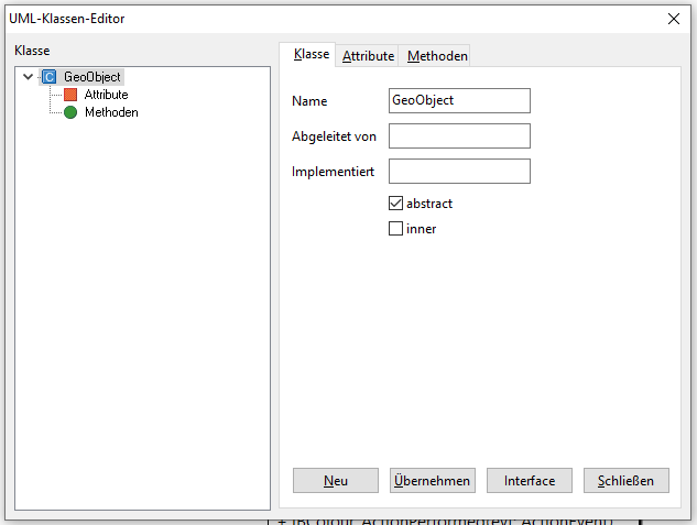 Im UML-Diagramm: Rechtsklick > Neue Klasse. In dem Fenster anschließend GeoObject als Klassenname angeben und Speichern klicken. In dem nun neugeöffneten Fenster unter der Registerkarte Klasse ein Häkchen bei abstrakt setzen.